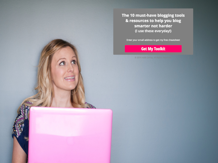 Here is an example of a landing page I have for my blogging toolkit. You can see that there is only one option for people to click on, and that is to sign up to get these awesome resources.