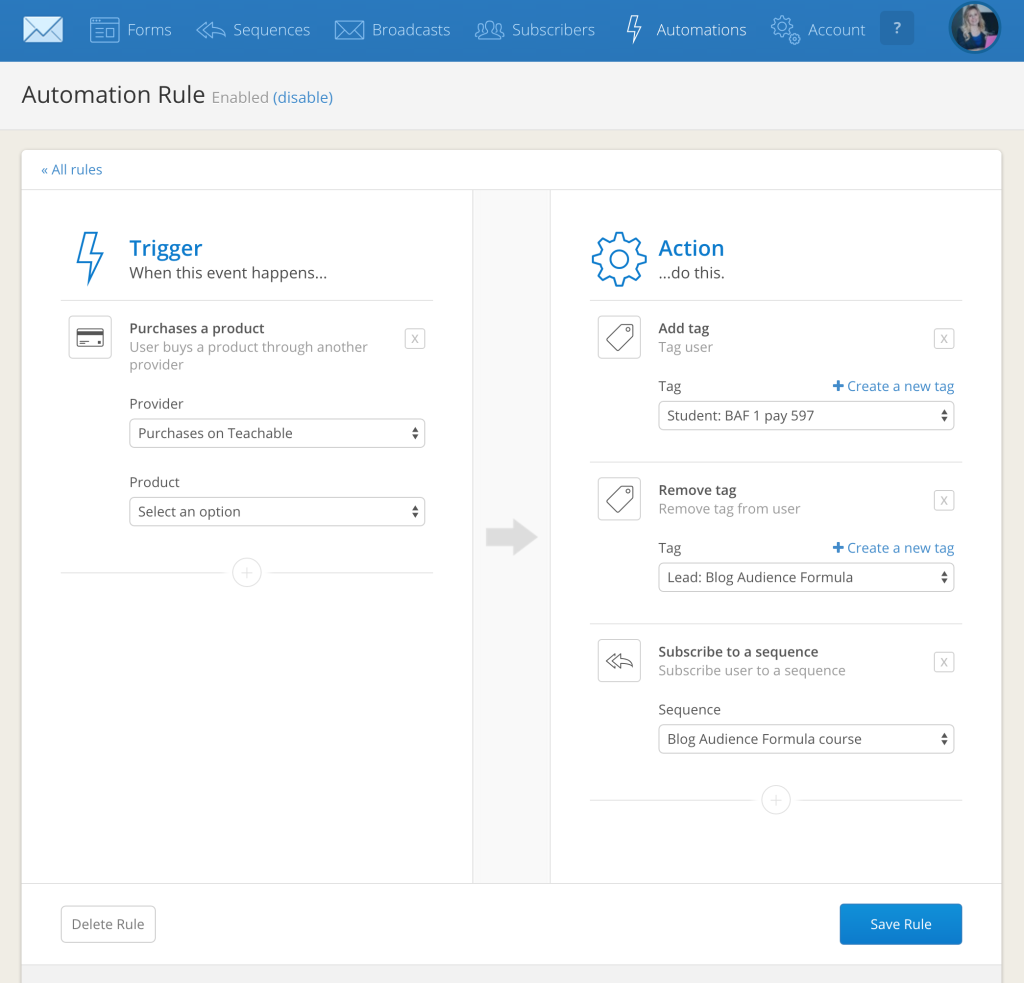 For example, when I was launching my course, Blog Audience Formula, I wanted to set up a rule for when someone purchased the course. Here’s how I did that-