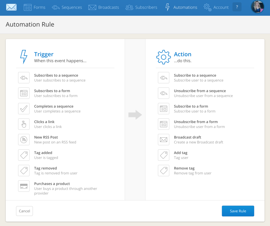 This is by far one of my favorite features of using Convertkit. You can set up automation rules to help you effectively communicate with your list. You can see all of the different automation rules you can set up below.